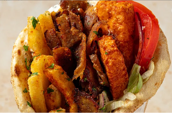 Veggies & sauce of your choice with tomato, onion, lettuce and potato fries. Wrapped in a warm pita bread. Sprinkles with fresh paprika, oregano and parsley